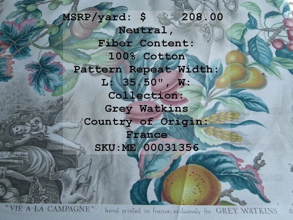 Scalamandre Vie A La Campagne Taupe French Country Toile Folklore Figure Fig Grape Harvest MSRP USD 208/Y
