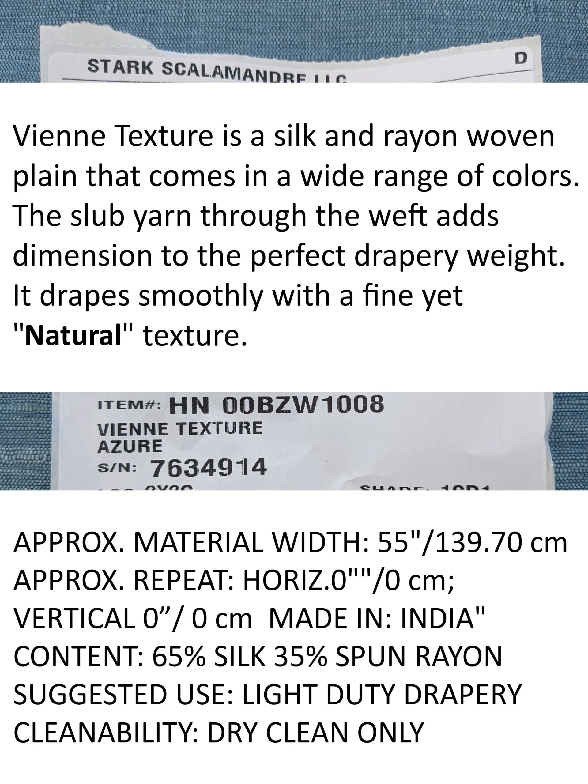 Vienne Texture is a silk and rayon woven plain that comes in a wide range of colors. The slub yarn through the weft adds dimension to the perfect drapery weight. It drapes smoothly with a fine yet “Natural” texture. Unlike solids, this textured silk displays a high iridescency and even a subtle 3-dimensional effect. It shimmers and changes in different lights and winds, almost like a gem stone.