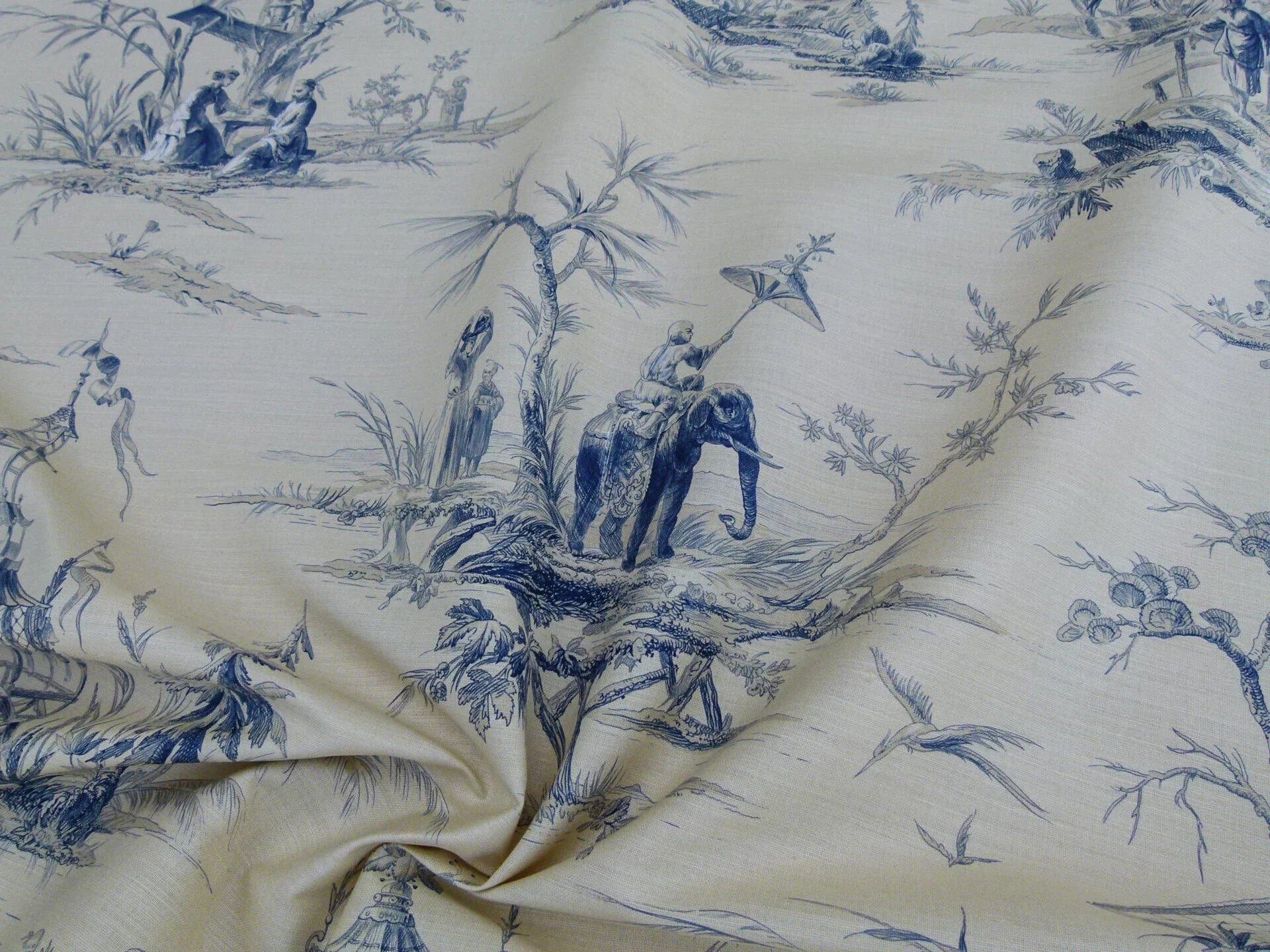 Scalamandre Voyage En Chine Print Bleu Chinoiserie Asian Garden Elephant Blue Beige MSRP USD 388/y