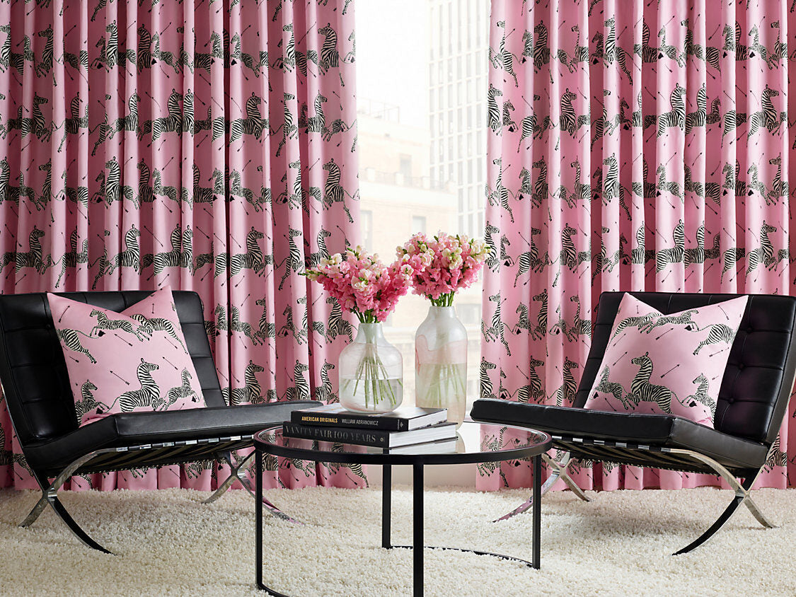 Over time, the Zebras design expanded to include a wider range of colors and introduced as a vinyl wallcovering and grasscloth. Additionally, the motif was adapted for fabric use, both indoors and outdoors. “Zebras Petite”, a fabric print available in a range of bold hues. Scaled down from the original size, the petite zebras dance across a polished cotton sateen. The zebras may be smaller, but they make for a graphic pop as statement drapes or memorable accent chairs. Colorways coordinate with Zebras Wallcovering and Zebras Embroidered Tape. Zebras has gained immense popularity in the industry and beyond, remaining a highly sought-after and globally recognized design. Delve into the comprehensive HISTORY OF ZEBRAS and explore its extensive product offerings to discover the full breadth of this iconic design.