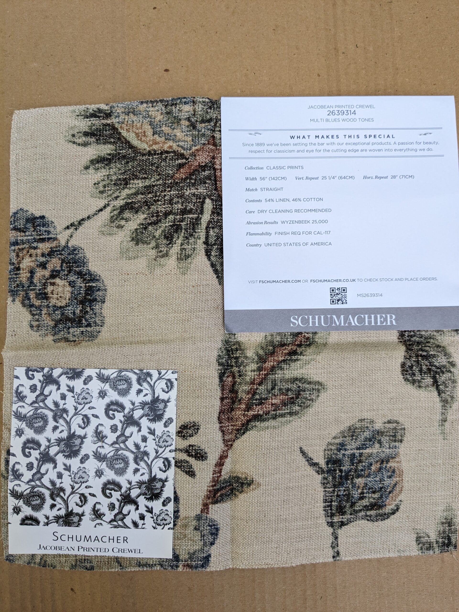 Schumacher Jacobean Printed Crewel in Multi Blues Wood Tones MSRP USD 296/y