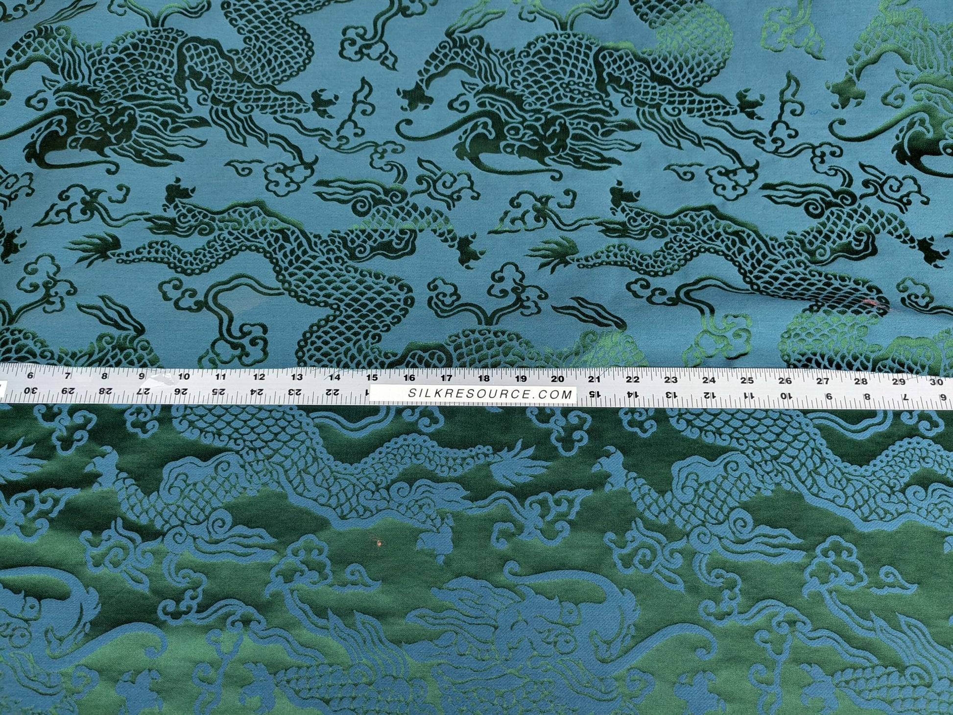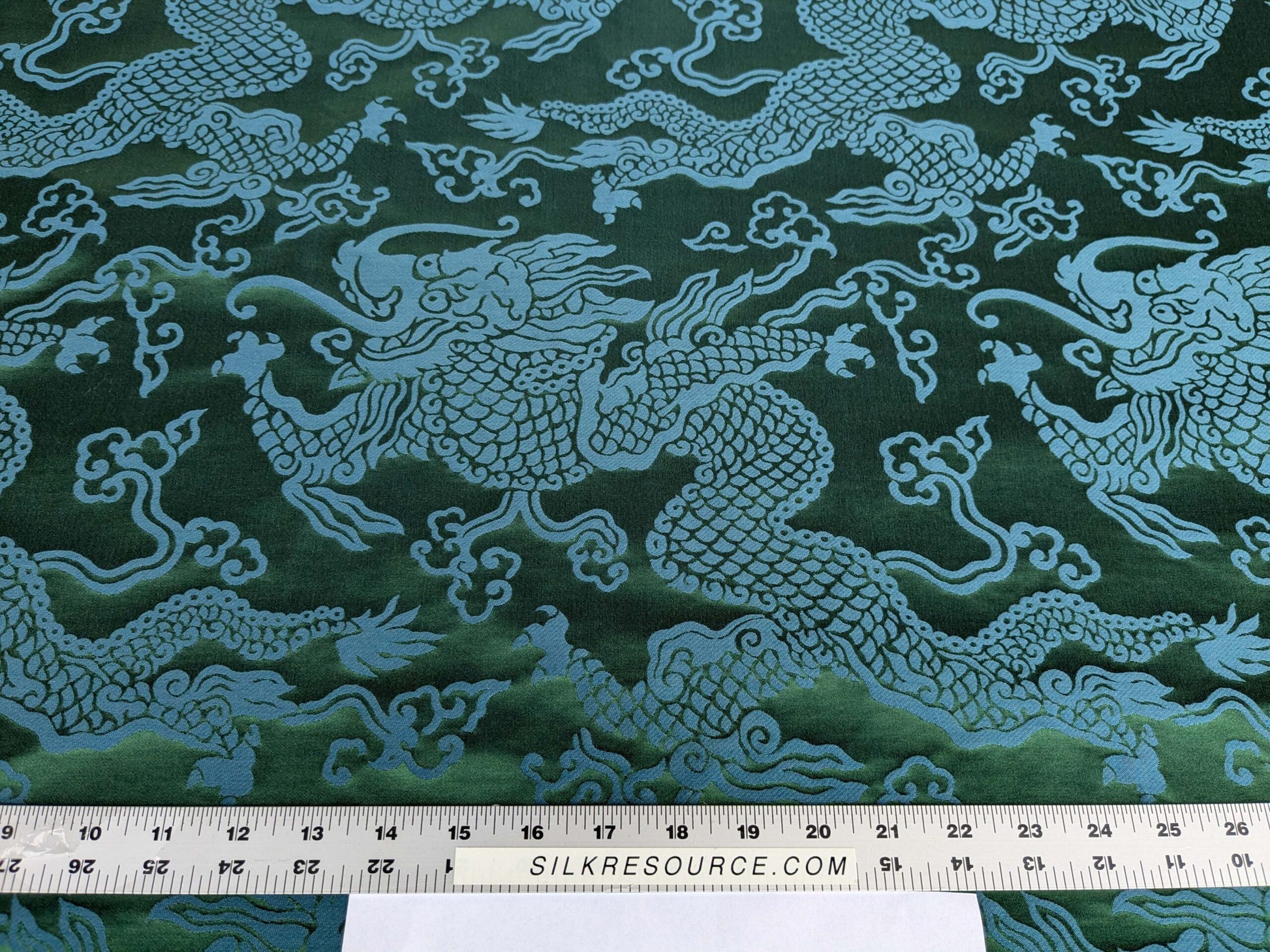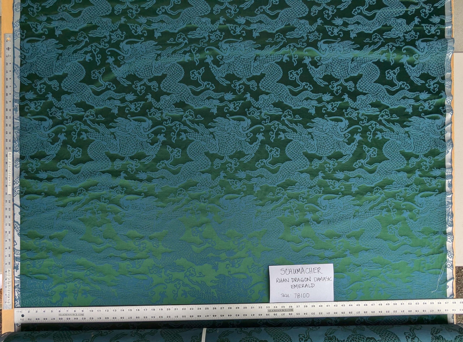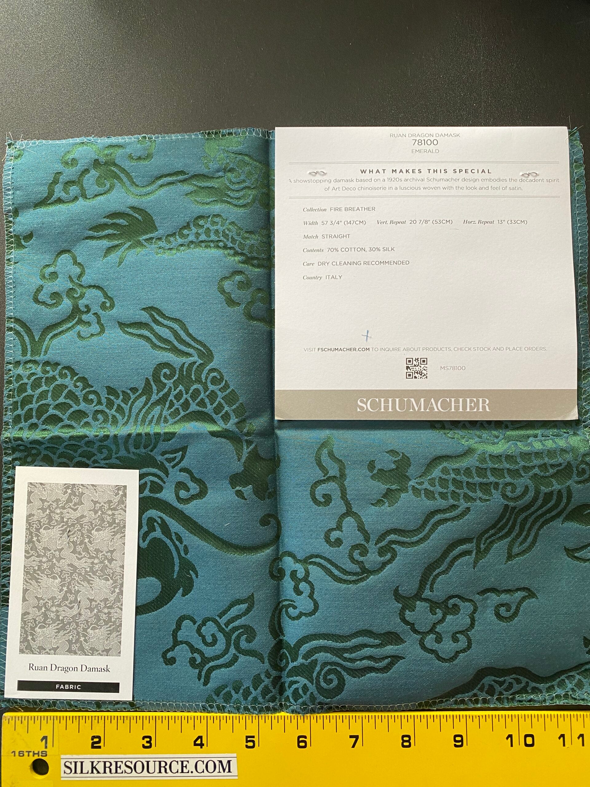 Schumacher Ruan Dragon Damask Emerald Green Art Deco Chinoiserie Satin Cotton MSRP USD 316/y