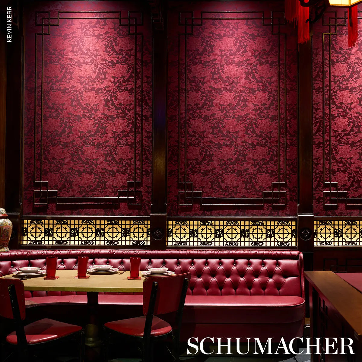 Schumacher Ruan Dragon Damask Garnet Red Art Deco Chinoiserie Satin Cotton MSRP USD 328/y