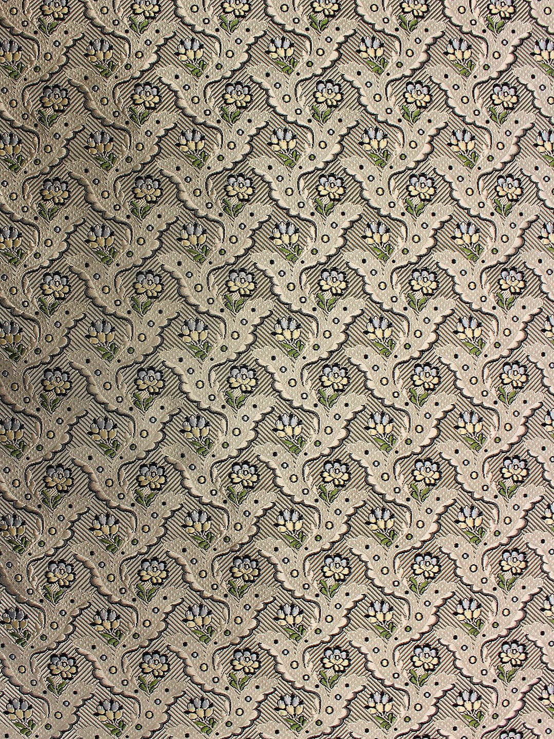 Drugget from the Louis XV period. This has a delicate motif of small shaded flowers emerging from a bordered garland on a geometric ground. The use of different weaves harmoniously complements the subtle background colors taken from the original design, it was most certainly used for both garments and furnishings when it was created. Chevalier Danceny is a character in the novel Liaisons Dangereuses by Choderlos de Laclos. He is young, handsome, elegant, chivalrous and brave, and a gentleman of honor.