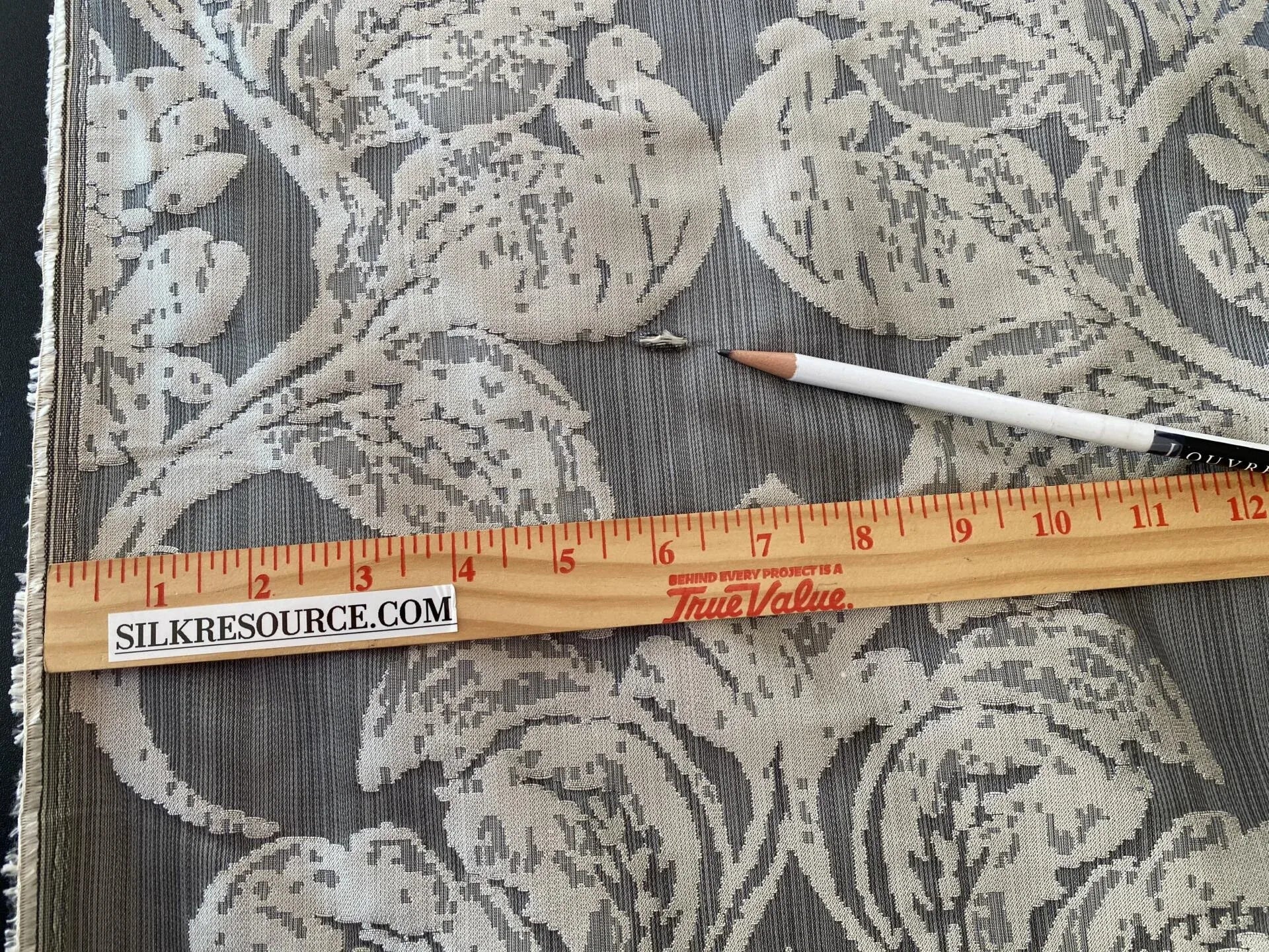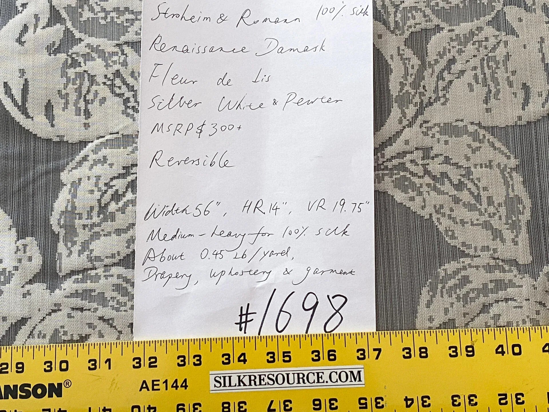 Indulge in the epitome of luxury with the Stroheim & Romann 100% Silk Renaissance Medallion Fleur De Lis Damask. Rendered in a sophisticated palette of Silver White & Pewter, this premium fabric stands out with its intricate design and superior quality. With a standard width of 56" and approximate repeats of 14" horizontally and 19.75" vertically, it's a showstopper in every sense.