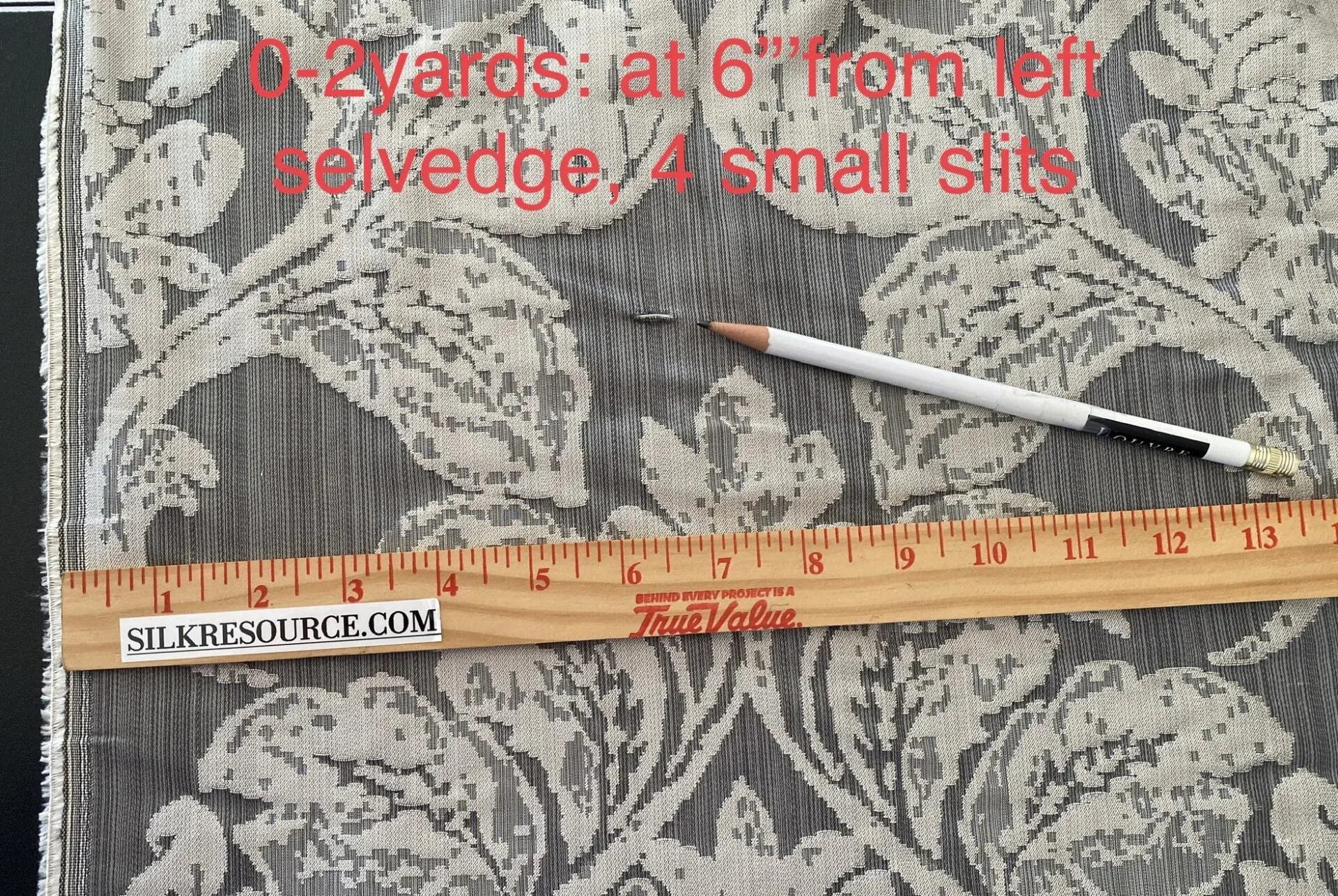 0-2 yards: at 6" from left selvedge, 4 small slits. It should not effect most projects. The rest is perfect.