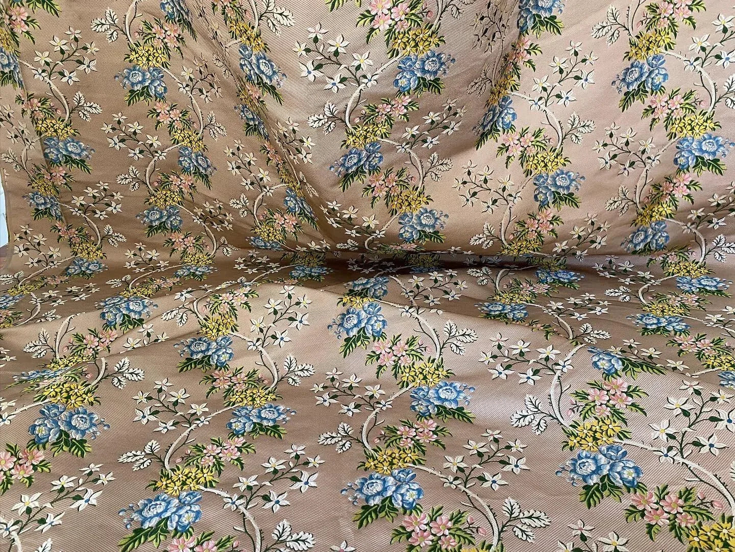 A Louis XV lampas on a "cannetille" ground. The garlands of colored flowers in shaded tones, twist vertically up a delicately textured surface originally one of the new floral designs made fashionable by Madame de Pompadour, Louis XV’s favorite. She liked to adorn herself with real or silk flowers as we can see from numerous portraits. Her salon in Bellevue was decorated with panelling sculpted with plant arabesques and floral furnishings. Under the influence of the marquise, the use of fresh colors created an atmosphere of eternal spring.
