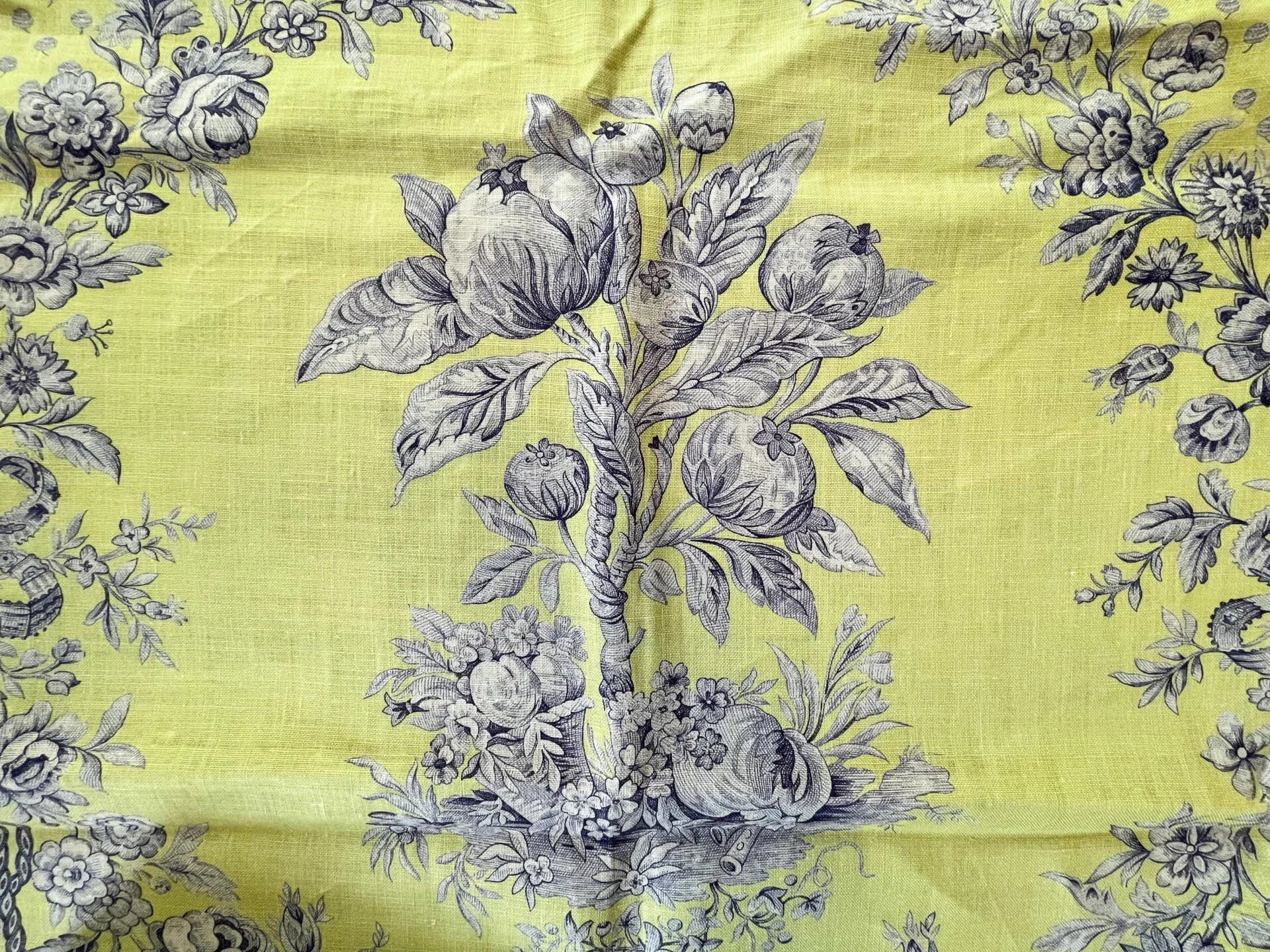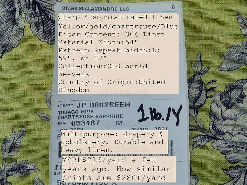 Tobago Hive Chartreuse Sapphire Scalamandre 100% Linen Tropical Apiculture Honey Beekeeping Tropical Flowers Ribbon TasselMSRP USD 280/Y