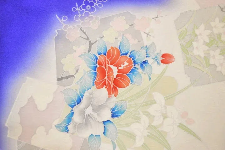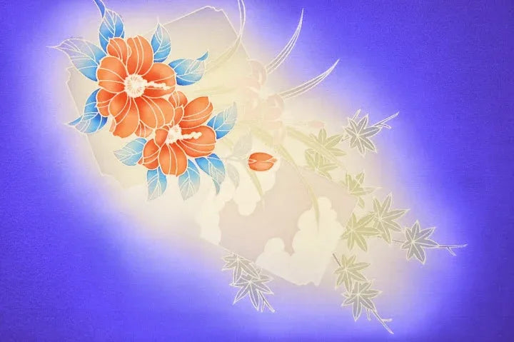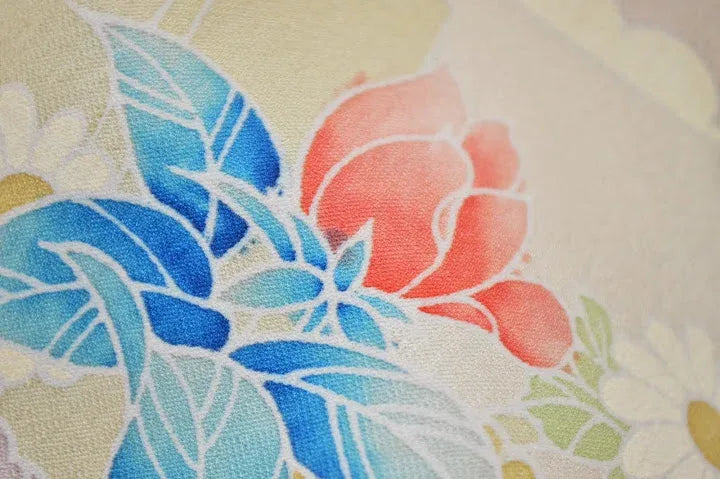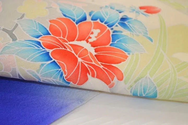 This is a rare kimono bolt for women. There are some stains and creases on the roll as shown on photos. There is a stain at the first 40cm of the bolt.